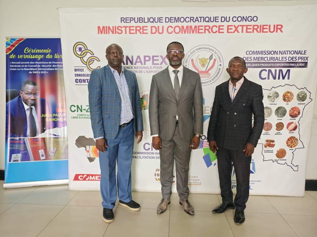 The preparatory meeting of the agricultural fair and conference in Washington DC and Virginia State USA on the oil palm chain with the coordinator in charge of fairs and exhibition to the cabinet of the Minister of Foreign Trade on 17/12/2025 in his office in Kinshasa Lingwala with the team of universal palm tree women of the Democratic Republic of Congo (DRC).